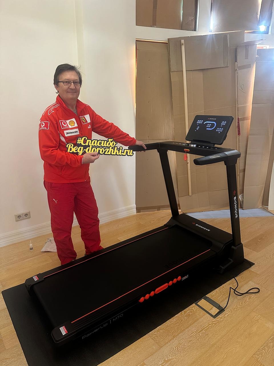 Бионик ПауэрАп м70 это классно. Это замечательно. Не идеально, но очень хорошо, а с учетом какого-то более-менее вменяемого ценника в рамках класса… Мне вот по хорошему не совсем ясно, чем может подкупить, скажем, спирит 485 блек, который вдвое больше стоит. Ну, классный. Ну, мировой бренд. Ну консоль покрасивее. Но при этом жесткий, бегать лучше в совсем легком темпе. Зачем это? Чтобы что? Внешность, отличные габариты полотна под любой рост и темп, мощный движок нового поколения, высочайший уровень поглощения ударной нагрузки. Беспроводной кардиодатчик Bluetooth подключается, есть интеграция с приложениями, автосмазка для лентяев вроде меня. Что еще можно просить от беговой дорожки? Чтобы калории сжигала, пока вы на диване лежите, разве что. Самая большая придирка – мало быстрых кнопок скорости и угла наклона. Твердые 5 баллов, мой новый фаворит!