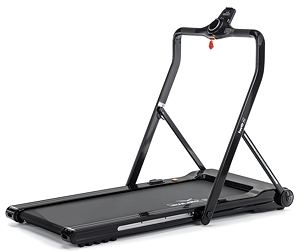 - С поднятым поручнем управляйте дорожкой с минималистичной консоли. Когда поручень опущен, управляйте тренировкой с удобного пульта.
