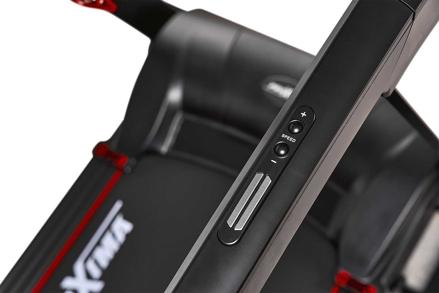 - Сенсорные датчики на поручнях измеряют сердечный ритм. Кнопки регулировки скорости и наклона на рукоятках позволят менять нагрузку без отрыва от тренировки.