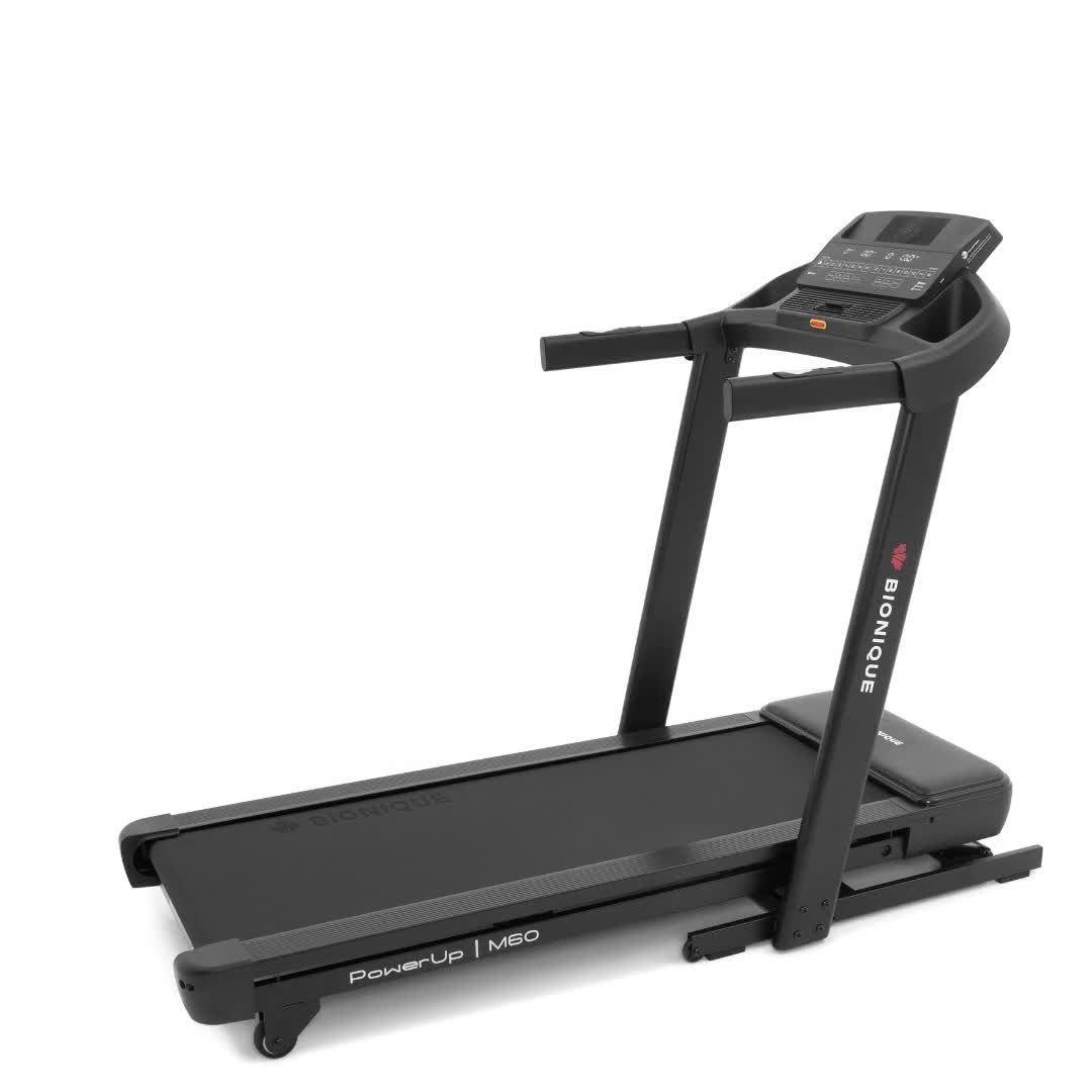 - Уникальной особенностью Bionique PowerUp M60 является технология автоматического складывания и раскладывания Easy-Lift™. Она позволяет складывать и раскладывать дорожку одним нажатием кнопки, что особенно удобно для женщин и пожилых людей. Система также оснащена датчиками безопасности, которые останавливают движение деки при обнаружении препятствия и предупреждают об опасности звуковым сигналом. В сложенном виде дорожка занимает менее 1 квадратного метра (93*82 см), что позволяет экономить пространство.